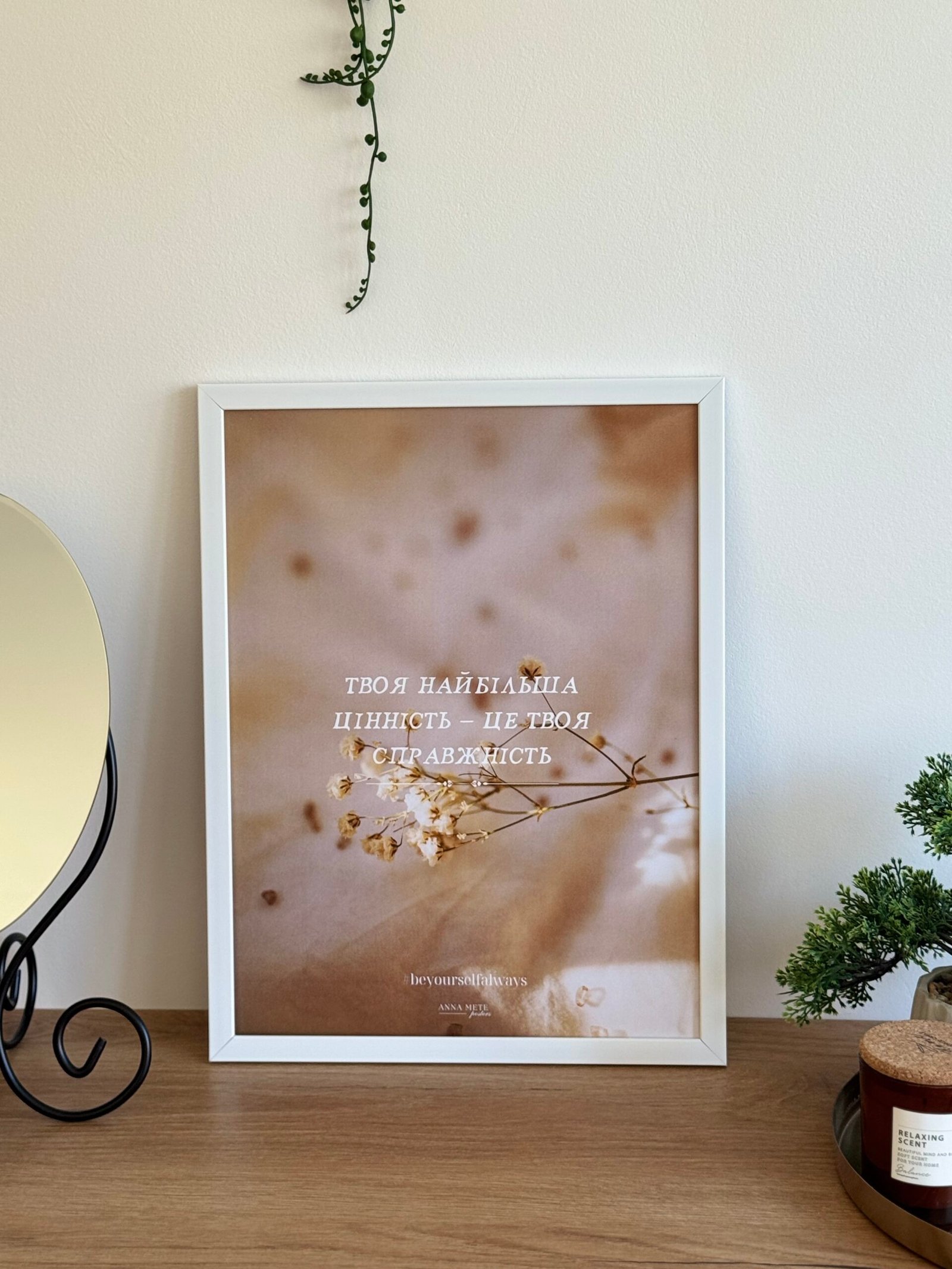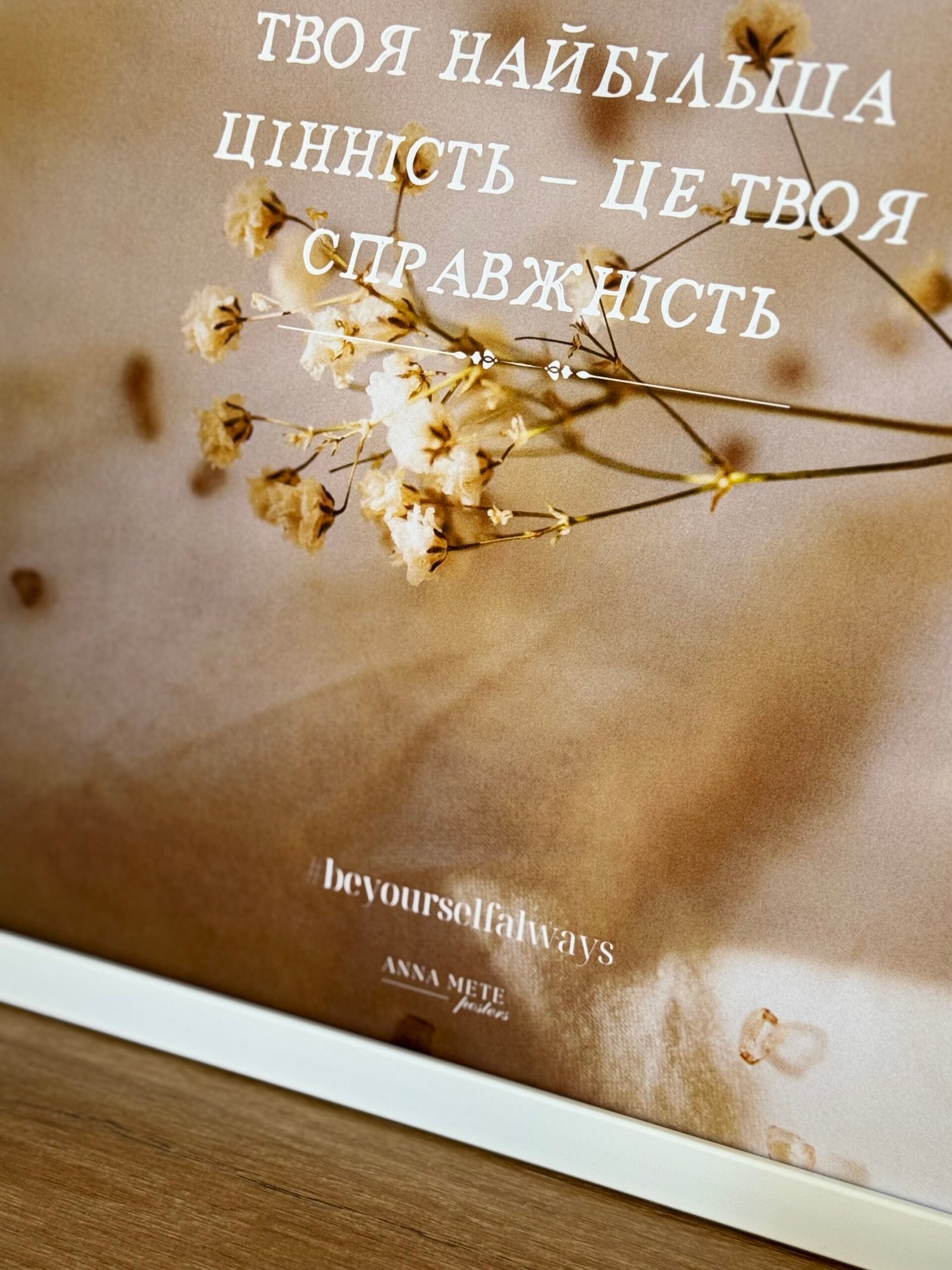 Ніжний постер із квіткою, що нагадує: найцінніше в людині — залишатися собою. У світі, де багато фальші, справжність — це сила. Цей постер створює атмосферу спокою, впевненості й прийняття. Він надихає бути собою щодня — щиро, сміливо, по-справжньому.